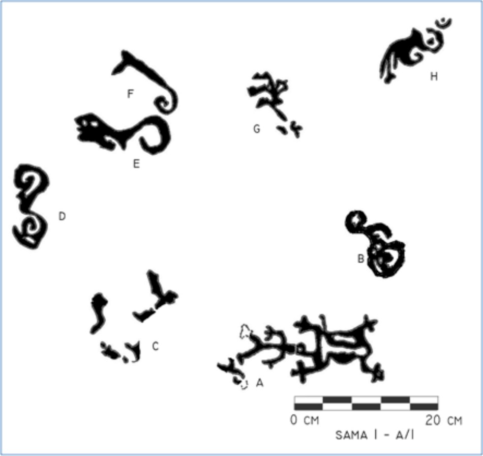 En el “sitio 2 SAMA 1”, que se encuentra a 300 metros de la desembocadura de un pequeño arroyo denominado Sama, se encuentran otros grabados en piedra uno de los cuales tiene cuatro metros de altura. Según el documento “el arroyo Sama es un cauce de agua permanente que ofrece recursos de pesca y es un paradero de caza. Esto explicaría las representaciones de fauna del sitio. La casi exclusividad de representaciones de espirales de la roca A, lleva a pensar, que las espirales son una representación ligada cercanamente al agua, la navegación o la pesca”.