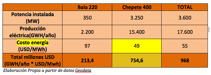 Si miramos con atención descubrimos la columna que dice “TOTAL”. Allí el “costo energía” de El Bala + Chepete sería de 55 USD por Mwh. A partir de estos datos podemos armar el siguiente cuadro que incluyen la columna del Chepete.