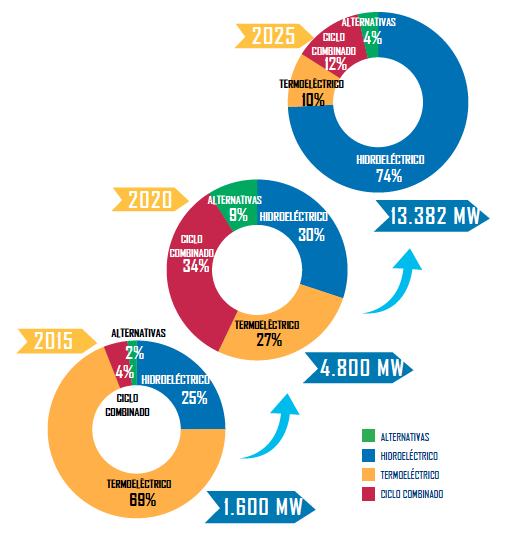 Para compensar la caída de ingresos por exportación de gas el gobierno busca construir varias mega hidroeléctricas que exportarían electricidad a los países vecinos. El plan es pasar de una potencia instalada de 1.600 MW a 13.382 MW hasta el 2025.