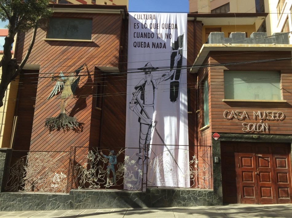 This building was once home to Walter Solón Romero, one of the nation’s most important and politically active artists. Known for his elaborate murals and fascination with Don Quijote, Solón paid the ultimate price when his son died in prison during the repressive 1970s. A sense of humor only slightly shades the visceral cry for justice in the maestro’s works.