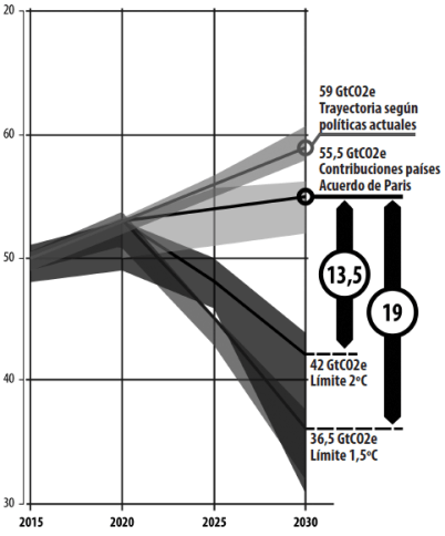 Según el informe “Brecha de Emisiones” del Programa de las Naciones Unidas para el Medio Ambiente con las contribuciones nacionalmente determinadas (CNDs) “incondicionales” de los países se reduciría apenas 3,5 GtCO2e. Es decir que en vez de llegar a las 59 GtCO2e en el 2030 se llegaría a 55,5 GtCO2e.