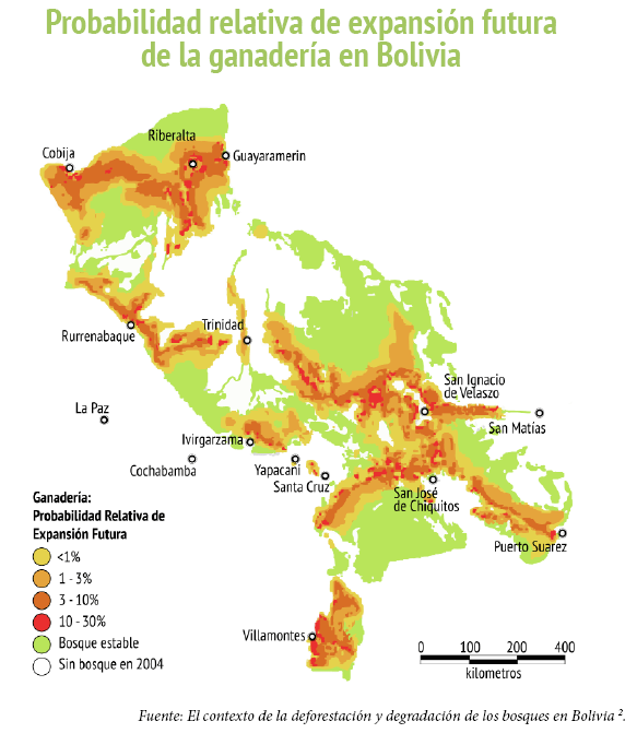El siguiente mapa elaborado en el año 2012 por Müller R. y otros autores hace un pronóstico de la expansión de la ganadería para el 2030 y muestra la gravedad de su impacto sobre la deforestación de las tierras bajas de Bolivia.