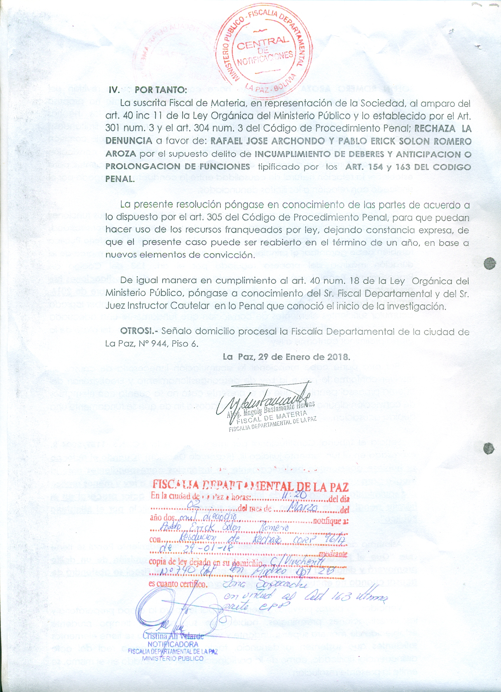 “La suscrita Fiscal de materia… RECHAZA LA DENUNCIA a favor de RAFAEL JOSÉ ARCHONDO Y PABLO SOLÓN ROMERO OROZA por el supuesto delito de INCUMPLIMIENTO DE DEBERES Y ANTICIPACIÓN O PROLONGACIÓN DE FUNCIONES….”