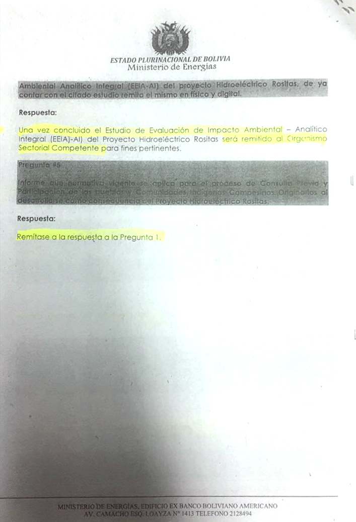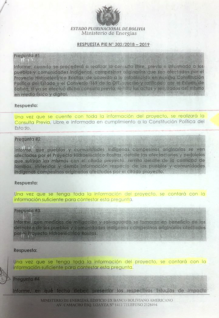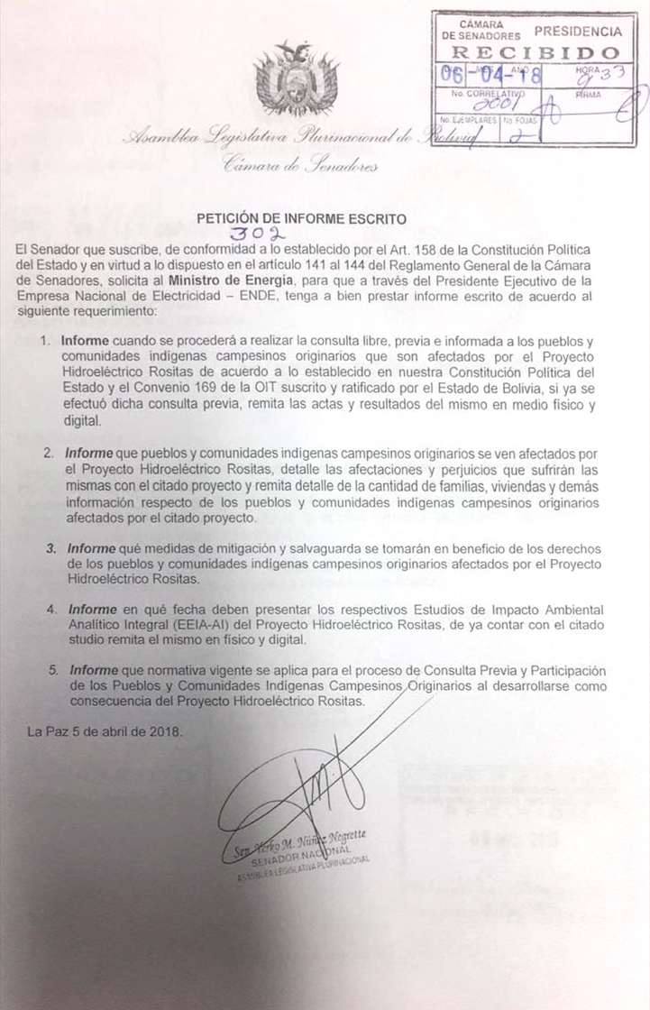 La Petición de Informe Escrito (PIE) corresponde al senador por Beni, Yerko Nuñez, y fue solicitada el pasado 6 de abril, siendo respondida recién este 10 de agosto. El cuestionario pide respuestas a la Empresa Nacional de Electricidad (ENDE), mediante el Ministerio de Energía, sobre el momento en el que se realizará la consulta libre, previa e informada a los pueblos y comunidades indígenas campesinas originarias que serán afectadas por el proyecto hidroeléctrico; detalle las afectaciones, perjuicios y cantidad de afectados, así como las medidas de mitigación; y presente el Estudio de Impacto ambiental Analítico Integrado.
