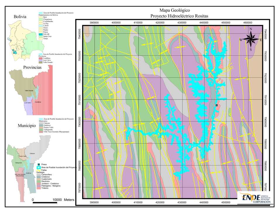 Precisamente la actividad geológica de la zona de impacto de Rositas está registrada en el mapa geológico del Proyecto hidroeléctrico elaborado por ENDE. Si se ve el mapa a continuación, las líneas amarillas indican las fallas de la zona.