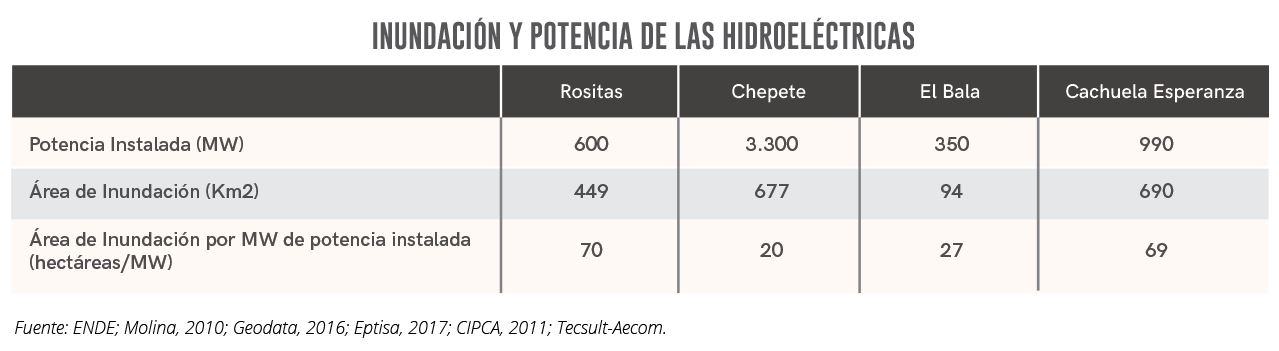 Si analizamos cuál inunda más por megawatt de potencia instalada, Rositas ocupa el primer lugar con 70 hectáreas por MW seguido muy de cerca por Cachuela Esperanza con 69 hectáreas por MW. En tercer lugar, se encuentra El Bala con 27 hectáreas por MW y en cuarto lugar, debido a tener la potencia instalada más grande (3.300 MW), está el Chepete con 20 hectáreas por MW.