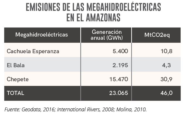 Algunos estudios reportan que “las plantas hidroeléctricas en el Amazonía producen más gases de efecto invernadero que las centrales termoeléctricas, debido a la descomposición de la vegetación del área que fue invadida por el agua y a las altas temperaturas, que proporcionan la emisión de metano” (Costa; Vibian et al. 2015). Estudios en otras represas de la Amazonía como Balbina demostraron que las emisiones de éstas son peores que los combustibles fósiles (Fearnside, 2009): “Estos estudios prueban que represas en la región amazónica tienen un impacto climático que es peor que la electricidad generada a través de carbón, diésel o gas” (Costa; Vibian et al. 2015). Tomando en cuenta que según un estudio publicado por International Rivers en 2008 las megahidroeléctricas en el Amazonas producen 2 Kg de dióxido de carbono equivalente por kWh podemos concluir que El Bala, Chepete y Cachuela Esperanza generarán 46 millones de toneladas de dióxido de carbono equivalente (MtCO2eq), una cifra que es igual a un tercio de las emisiones de Bolivia en el año 2014.