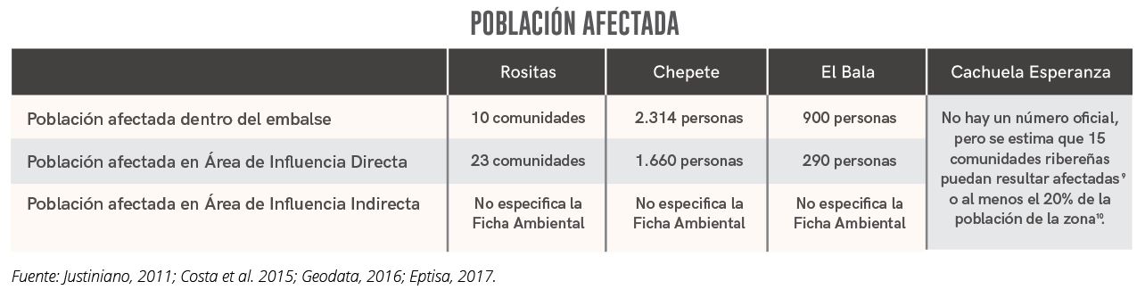 De manera preliminar, las megahidroeléctricas El Bala, Chepete y Rositas pueden llegar a desplazar entre 7.000 y 8.000 personas. En el caso de El Bala y el Chepete hay un cálculo en las fichas ambientales y sus anexos de cuántas personas estarían dentro de los embalses (3.214) y cuántas en las áreas colindantes (1.950). En el caso de Rositas sólo se menciona que 23 comunidades serían afectadas sin cuantificarse la cantidad de personas que deberían ser relocalizadas. Según las propias comunidades, aproximadamente 500 familias serían afectadas.
