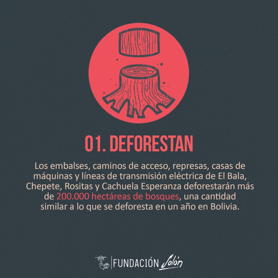 1. Los embalses de las mega hidroeléctricas son una de las principales causas de la deforestación y destrucción del hábitat de pueblos, animales y plantas. El Bala y el Chepete deforestará más de 80.000 hectáreas de bosque amazónico.