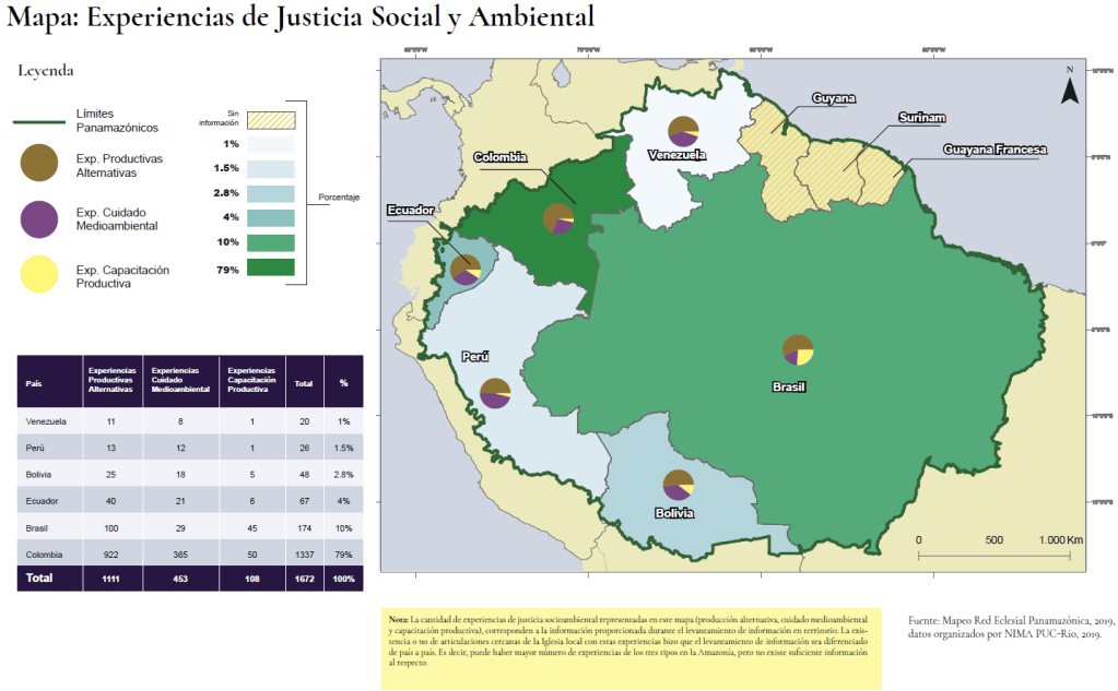 A nivel panamazónico, existen diferentes experiencias que surgen como alternativas en búsqueda de una justicia socioambiental en la región. El estudio del REPAM se enfoca específicamente en tres experiencias: producción alternativa, cuidado ambiental y capacitación productiva. Bajo la propuesta de este marco comparativo se puede observar que, a nivel porcentual, Venezuela se posicionaría como el país con menor experiencias de justicia social y ambiental de la región, seguido por Perú y luego Bolivia. Mientras que, en contraste, Colombia se posiciona como el país amazónico con mayores experiencias de justica a las problemáticas socioambientales. Estos datos revelan la gran brecha que existe entre los diferentes países panamazónicos respecto a cómo crear experiencias para la búsqueda de una justicia socioambiental y para crea alternativas frente al modelo extractivista.