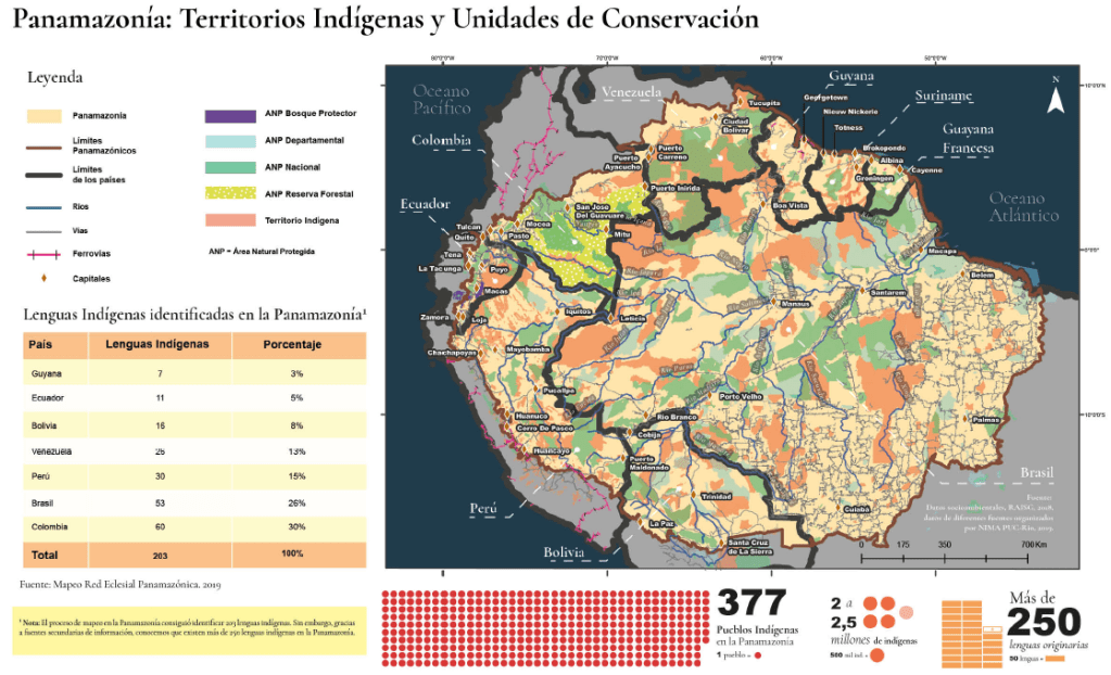 La Red Eclesial Panamazónica REPAM presentó recientemente su Atlas Panamazónico: Aproximación a la realidad eclesial y socioambiental en el cual expone diferentes datos sociales, económicos, ambientales, políticos y culturales de esta región. La panamazonía comprende el territorio conformado por la Cuenca del Amazonas. Políticamente este territorio alcanza parte de Brasil, Bolivia, Perú, Colombia, Ecuador, Guayana, Guayana Francesa, Surinam y Venezuela. De conjunto comprende 8 millones de kilómetros cuadrados, que equivalen al 40% de la extensión de toda Sudamérica, y alberga aproximadamente a 33.6 millones de personas.