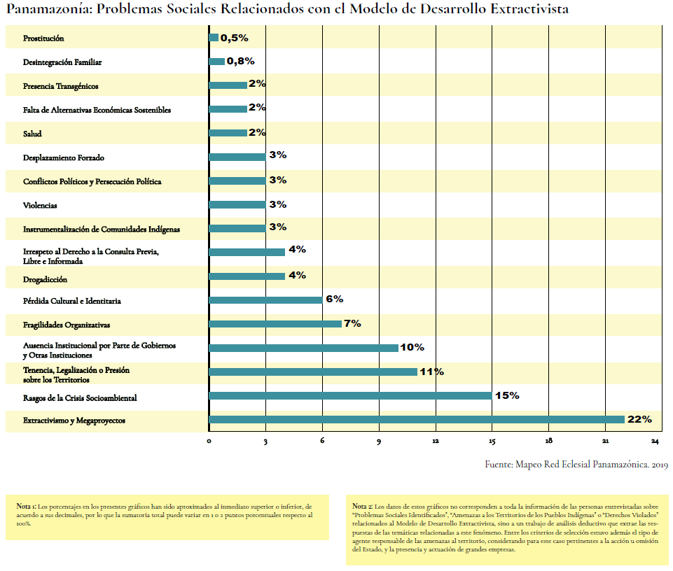 Producto de las actividades extractivistas, la deforestación y la expansión de la frontera agraria, se generan una diversidad de problemáticas sociales. Según el sondeo realizado por la REPAM, las principales problemáticas sociales en la amazonia están relacionadas con: