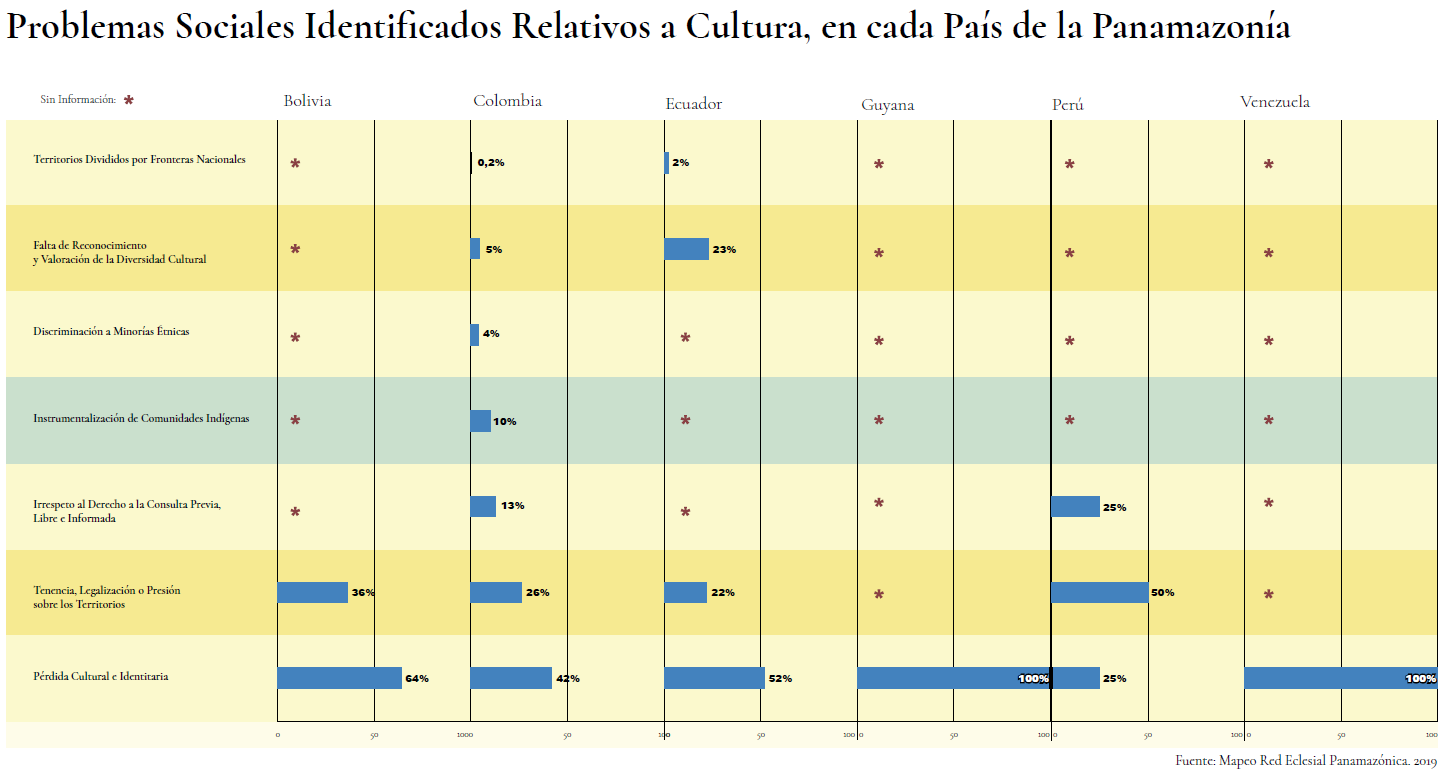 Específicamente, los problemas sociales identificados por el Atlas Panamazónico relativos a temas culturales por país se centrarían en: la perdida cultural e identitaria (Bolivia, Colombia, Ecuador, Guyana, Perú y Venezuela), la tenencia y la presión sobre los territorios (Brasil, Bolivia, Colombia, Ecuador y Perú), el irrespeto al derecho de la consulta previa, libre e informada (Colombia y Perú) y la falta de reconocimiento y valorización de la diversidad cultural (Ecuador).