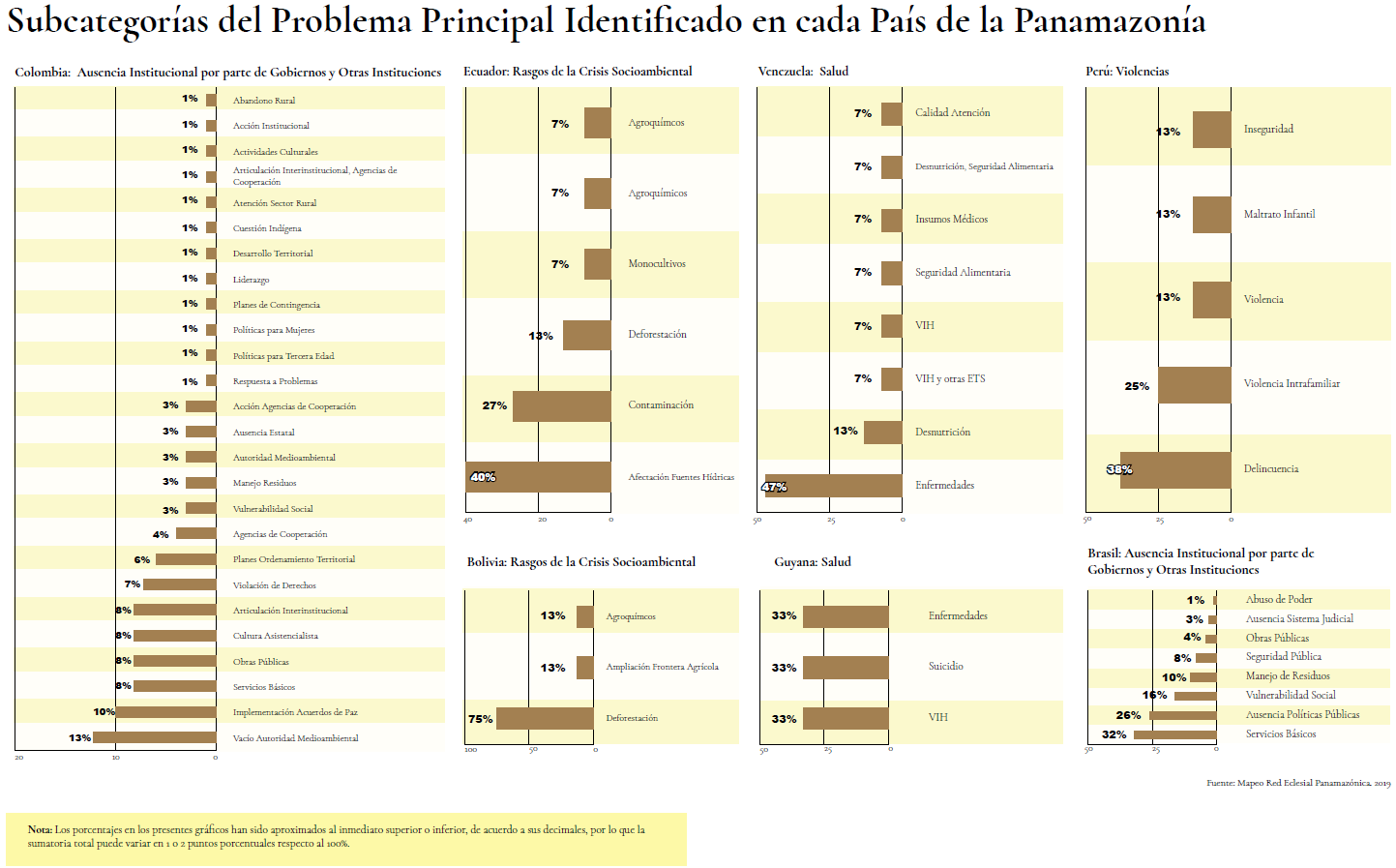 De los principales problemas sociales arriba identificados, la REPAM destaca las más relevantes a nivel de cada país panamazónico, siendo estas: la ausencia institucional por parte de Gobiernos y otras instituciones (Brasil y Colombia), Salud (Venezuela y Guyana), rasgos de la crisis socioambiental (Bolivia y Ecuador), y Violencia (Perú).