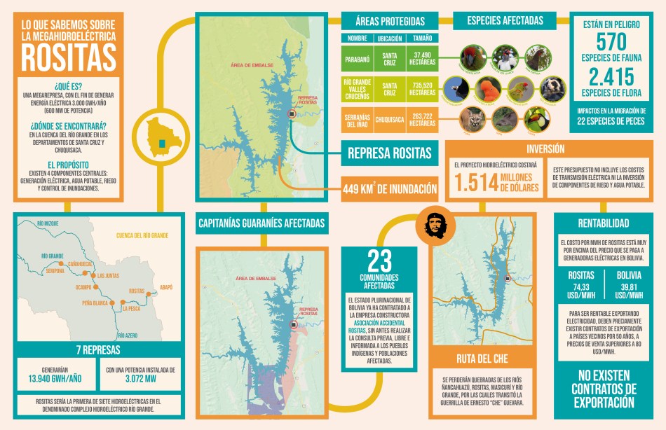 Del análisis de este informe se constata que esta mega hidroeléctrica provocará una inundación de 449 km2, una superficie equivalente a 3 veces la mancha urbana de La Paz. Si se construye será el tercer lago mas grande de Bolivia. Afectará a 3 áreas protegidas: Parque Nacional – Área Natural de Manejo Integrado Serranía del Iñao; Área Natural de Manejo Integrado Río Grande – Valles Cruceños y la Reserva Municipal de Parabanó. Los impactos ambientales son catalogados como muy altos y críticos. La afectación será enorme a la flora, la fauna y los peces que no podrían franquear los 162 metros de la represa. Y por si esto fuera poco, el informe señalado dice textualmente: “Existiendo el peligro de una subestimación del riesgo sísmico de la Represa Rosita en el sector de Abapo provincia Cordillera del Departamento de Santa Cruz”.