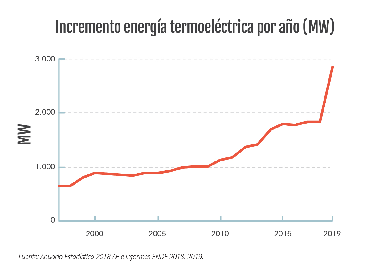 Las centrales termoeléctricas que funcionan principalmente a gas natural han sido las que más han crecido en los últimos 13 años. Durante el gobierno de Evo Morales las termoeléctricas se duplicaron pasando de una potencia instalada de 926 MW en 2006 a 1.855 MW en 2018. El año 2019 pegaron un nuevo salto con la inauguración de tres plantas de ciclo combinado con una capacidad total de 1.000 MW, lo que eleva la potencia instalada termoeléctrica a 2.855 MW en el Sistema Integrado Nacional (SIN)