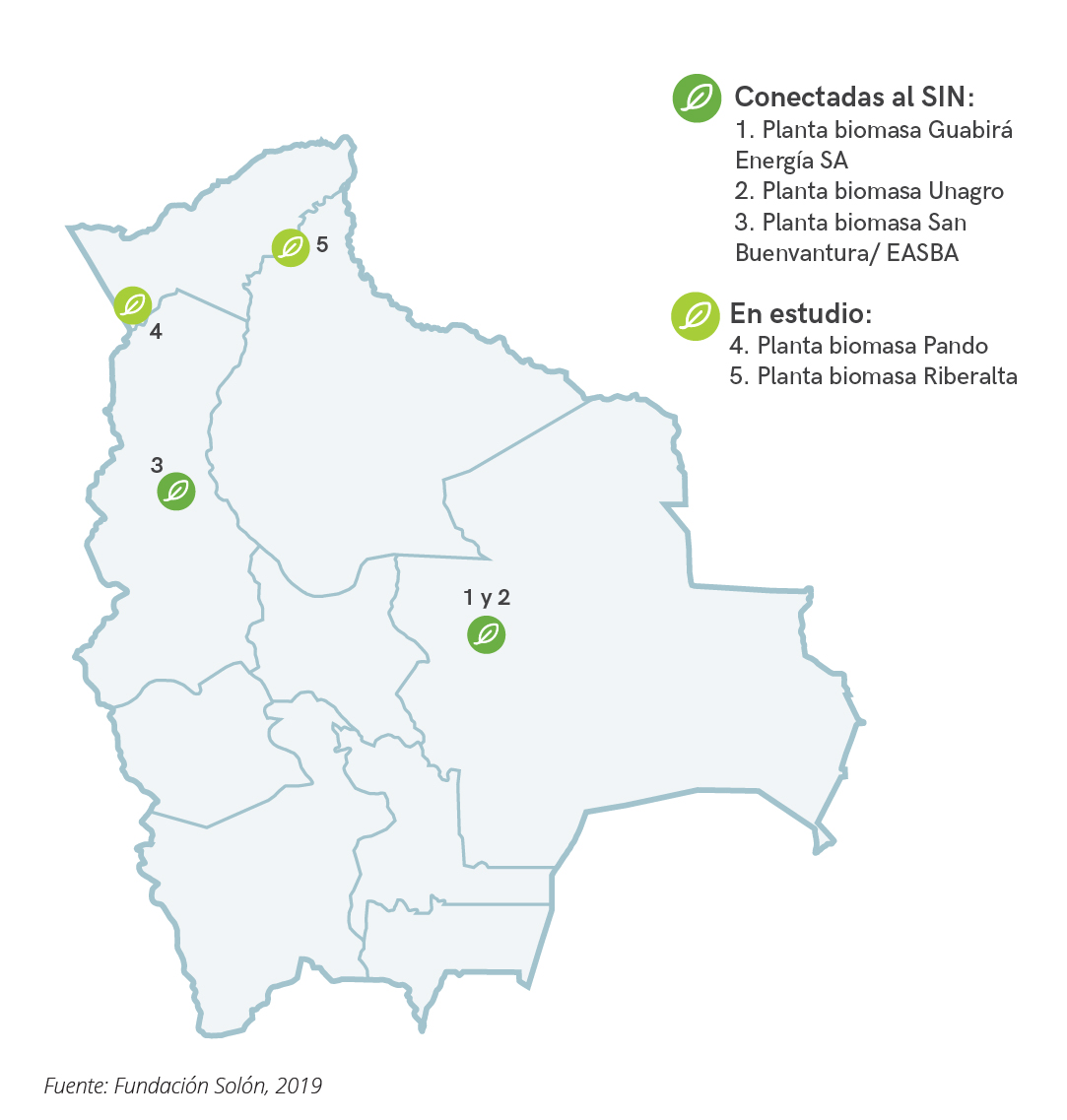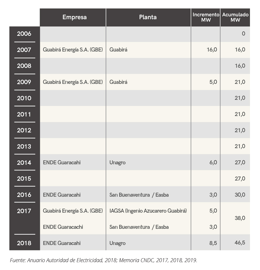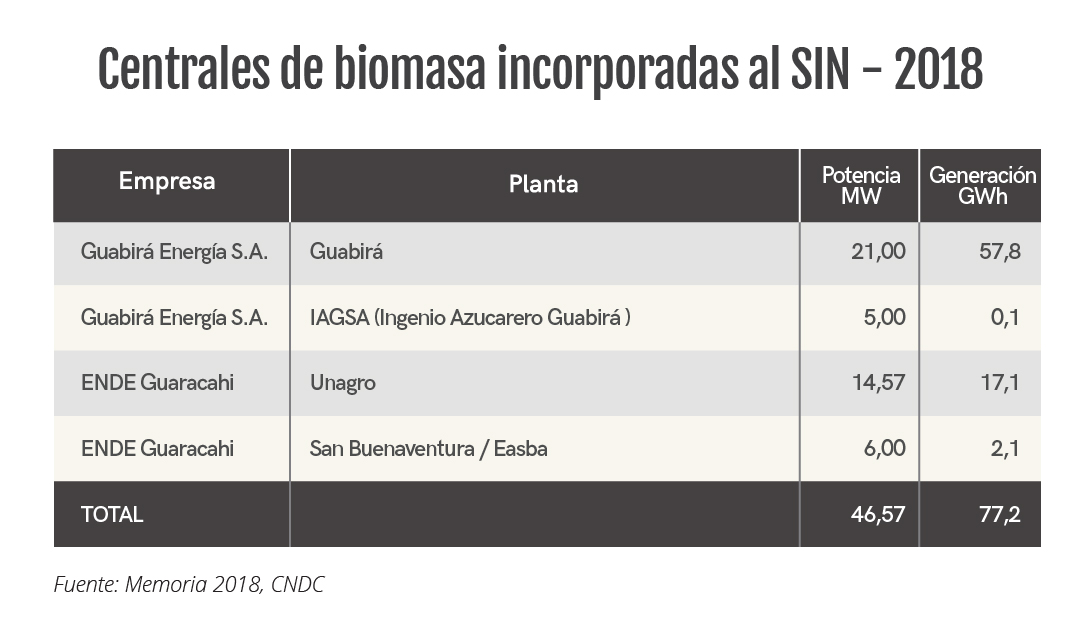 En 2007 Guabirá fue la primera planta de biomasa que ingresó al Sistema Interconectado Nacional (SIN) con 21 MW de potencia instalada. En 2014 los excedentes del complejo cañero de la Unión Agroindustrial de Cañeros SA (Unagro) se incorporaron al SIN con 6 MW. En 2016 la Empresa Azucarera San Buenaventura (Easba) se conectó al SIN con 3 MW hasta llegar a los 6 MW en 2018. En julio de 2017 inició operaciones comerciales el Ingenio Azucarero Guabirá Sociedad Anónima (IAGSA) con 5 MW. Y en 2018 Unagro adicionó 8,67 MW haciendo un gran total de todas las plantas de biomasa de 46,57 MW hasta el 2018 según el CNDC.