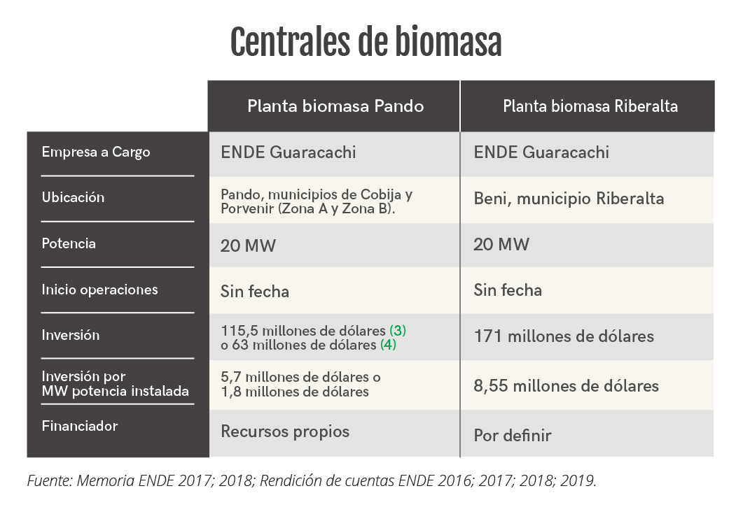 Según la rendición de cuentas del Viceministerio de Electricidad y Energías Alternativas (VMEEA) de enero de 2019, las plantas de biomasa de Pando y de Riberalta estarían en gestión de financiamiento, luego que en 2015 se licitaran los estudios Integral Técnico Económico Social y Ambiental (TESA). Según las convocatorias para los estudios TESA, ambos proyectos serían parte de los Sistemas Aislados (SA) de Cobija y Riberalta Guayaramerín. Si bien los estudios no son públicos hasta el momento, según los datos preliminares ambas plantas generarían aproximadamente 40 MW (2); sin embargo, la rendición del VMEEA establece que ambas plantas generarían 20 MW, mientras la rendición de cuentas de ENDE 2018 no menciona la planta de Riberalta. También existen diferentes versiones sobre la inversión total que requerirían estas plantas.