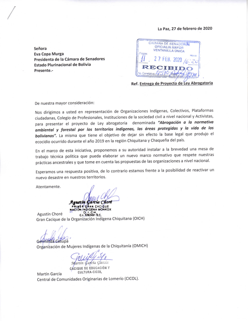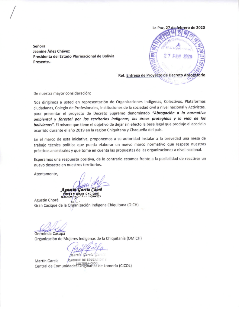 Frente a los incendios del 2019 que arrastraron con 5 millones de hectáreas (de las cuales más de 2 millones de hectáreas corresponden al bosque chiquitano y amazónico), el pasado 27 de febrero una comisión de organizaciones indígenas de la Chiquitanía – Organización Indígena Chiquitana (OICH), Organización de Mujeres de la Chiquitanía (OMCH) y Central de Comunidades Originarias de Lomerío (CICOL) – en representación de distintos colectivos e instituciones ciudadanas de Santa Cruz y La Paz, presentó ante la Asamblea Legislativa Plurinacional y a la Presidenta del Estado un proyecto de ley y de decreto supremo para la abrogación de las leyes “incendiarias” que causaron el ecocidio del año pasado.