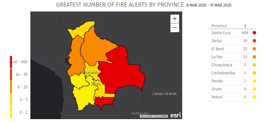Dentro del departamento de Santa Cruz, las provincias que reportan mayor alerta por incendios durante estas fechas fueron: Chiquitos con 400 focos, José Miguel de Velasco con 97, Cordillera 58, Ñuflo de Chavez con 34 y por último Andrés Ibáñez con 10 focos de fuego.