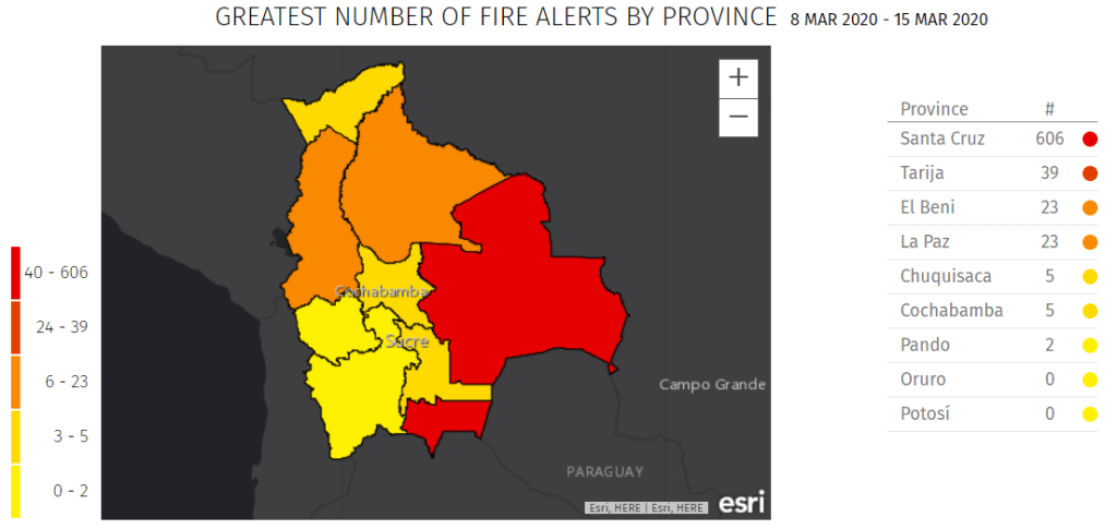 Sin embargo, el incendio en el parque nacional Otuquis no es el único incendio que viene desarrollándose en el territorio nacional. En base a imágenes satelitales de la NASA, el informe realizado por Global Forest Watch señala que entre el 8 y el 15 de marzo de este año se registraron 673 alertas de incendio en todo el territorio nacional. De estas, 606 ocurrieron en Santa Cruz, 39 en Tarija y 23 en Beni.