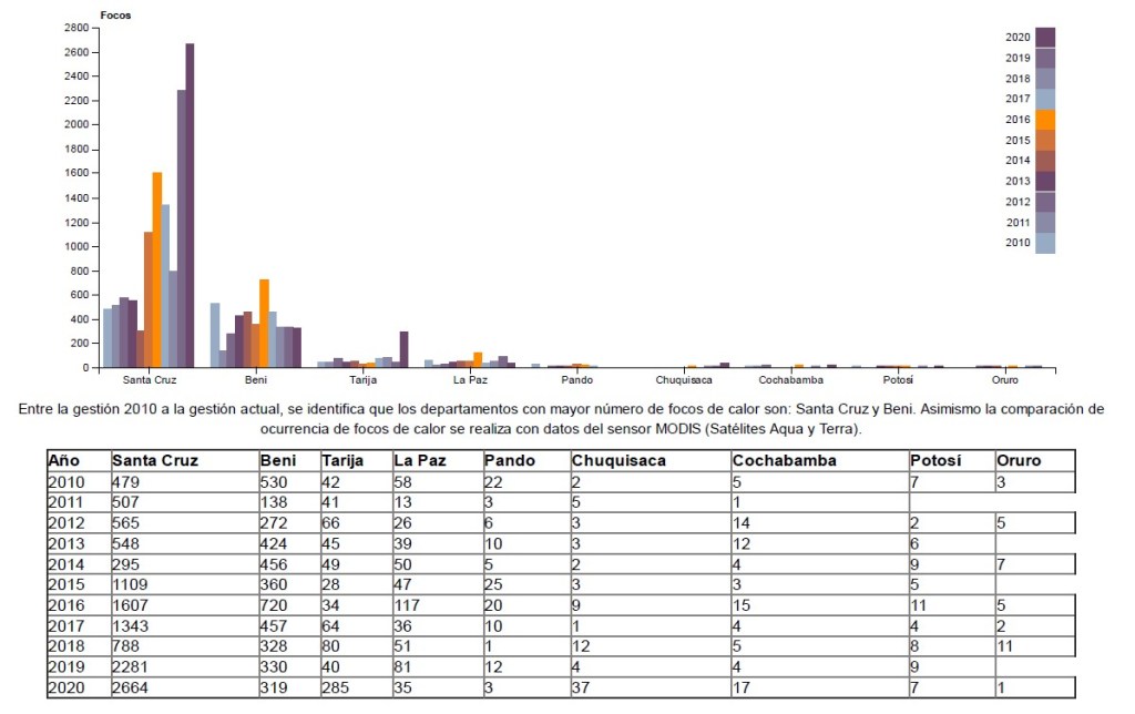 Los departamentos que al 19 de abril acumularon la mayor cantidad de focos de calor fueron: Santa Cruz con 2.664, Beni con 319 y Tarija con 285. Según el mismo informe del MMAyA, desde el 2010 al 2020 Santa Cruz encabeza la lista con la mayor cantidad de focos de calor acumulados al 19 de abril (gráfica II).