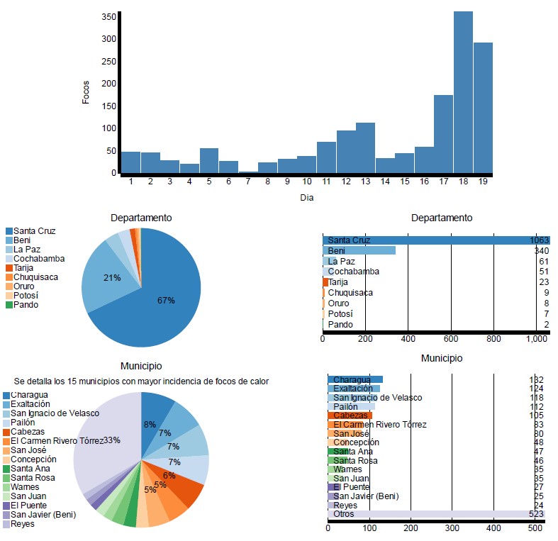 Asimismo, del 1 al 19 de abril de este año se registraron 1,564 focos de calor en todo el país. Santa Cruz ocupa el primer lugar con 1.063 focos de calor (equivalente al 67%), seguido de Beni con 340 (21%) y La Paz con 61 (4%). Los principales municipios afectados en Santa Cruz son: Charagua con 132, San Ignacio de Velazco con 118, Pailón con 112 y Cabezas con 105 focos. En el Beni el municipio mas afectado es Exaltación con 124 incendios (gráfica III).