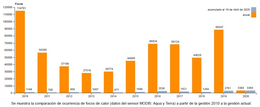 Hasta el 19 de abril del 2020 se registraron en Bolivia 3.368 focos de calor. Esta cifra es la más alta de la última década según los datos del Reporte Oficial de Focos de Calor e Incendios Forestales del Ministerio de Medio Ambiente y Agua (MMAyA) (gráfica I).