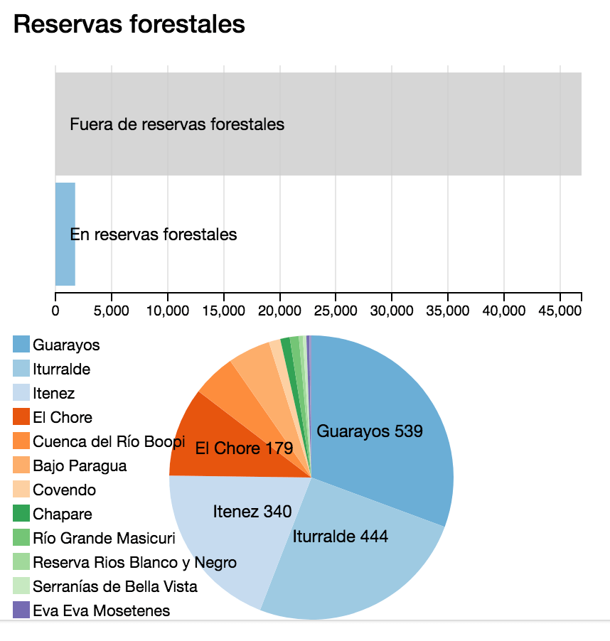 La situación es aun más grave. Si tomamos en cuenta los incendios en áreas boscosas el incremento sube al 11,3% (17.285 el 2019 vs. 19.243 el 2020), y si nos fijamos solamente en los incendios en reservas forestales el incremento es del 42% (1.236 el 2019 vs 1.759 el 2020). El año pasado las reservas forestales que más incendios tuvieron en el periodo 1/1 al 22/7 fueron Iturralde, Guarayos y El Chore, mientras este año son Guarayos, Iturralde e Itenez.