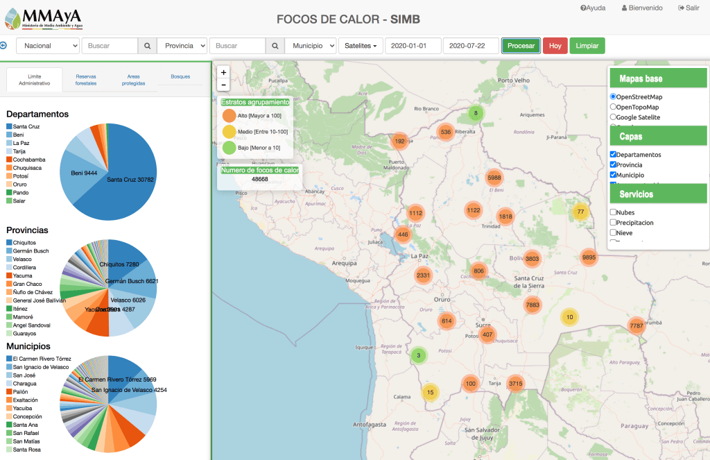 Entre el 1 de enero y el 22 de Julio del 2020 se han registrado, según el Sistema de Información y Monitoreo de Bosques (SIMB) del Ministerio de Medio Ambiente y Agua (MMAyA), 48.668 focos de calor. Durante el mismo período, el 2019 se registraron 44.902 focos de calor. Esto significa un incremento de 8,3% de focos de calor en relación al 2019.