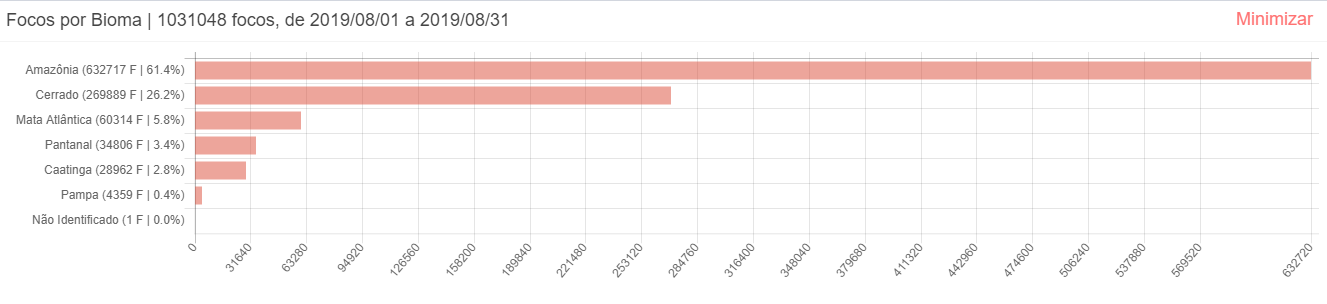 [3] Mientras que en entre el 01 de enero al 31 de agosto del 2020 se registraron 303.422 focos de quema acumulados, un aumento del 377% en comparación al 2019, donde se registraron 63.646 focos de quema en el mismo periodo. Véase: http://queimadas.dgi.inpe.br/queimadas/portal
