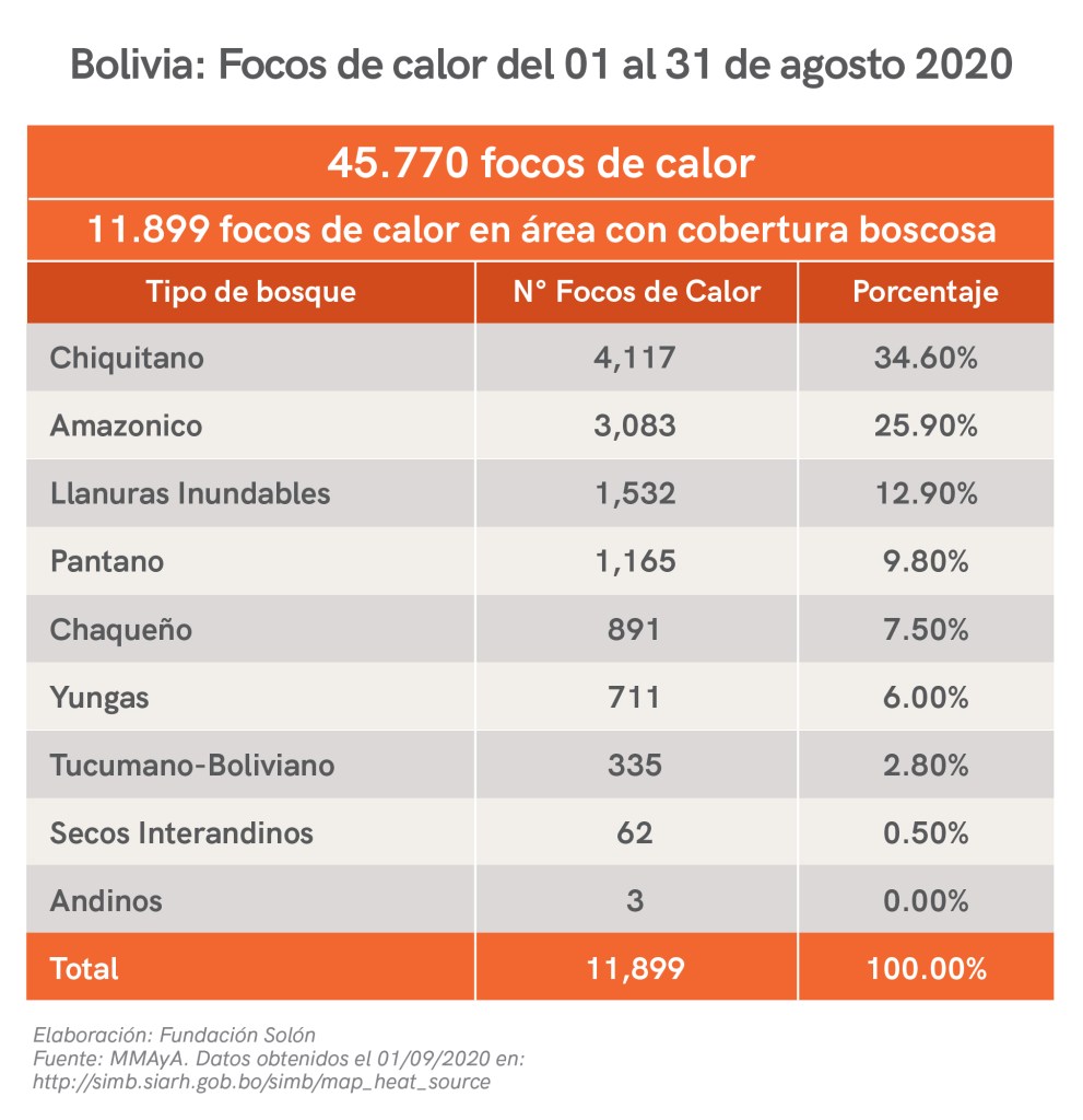 Si bien en Bolivia durante el mes de agosto hubieron menos focos de calor que el año pasado,[9] los registros acumulados hasta la fecha no dejan de ser inquietantes.