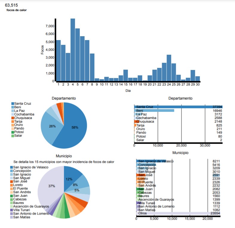 A nivel departamental, Santa Cruz concentró el 58% del total de los focos de calor registrados en noviembre, seguido en segundo lugar por Beni con el 26%; porcentajes muy similares al mes de noviembre del 2019. Los principales municipios con mayor incidencia de focos de calor en el 2020 fueron: San Iganacio de Velazco (8211 focos), Concepción (5416 focos), San Ignacio (departamento del Beni) (3209 focos), San Miguel (3010) y San José de Chiquitos (2591).