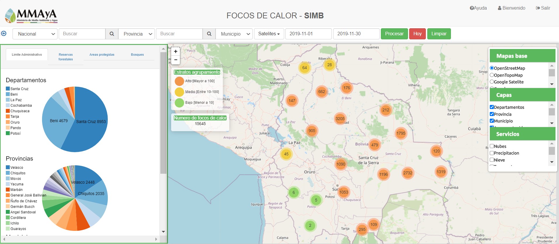 El Ministerio de Medio Ambiente y Agua (MAAyA), mediante su Sistema de Información y Monitoreo de Bosques (SIMB) registro en todo el mes de noviembre de este año 63.515 focos de calor. Esto es cuatro veces más que el 2019, cuando se registraron 15.645 focos de calor en todo noviembre.