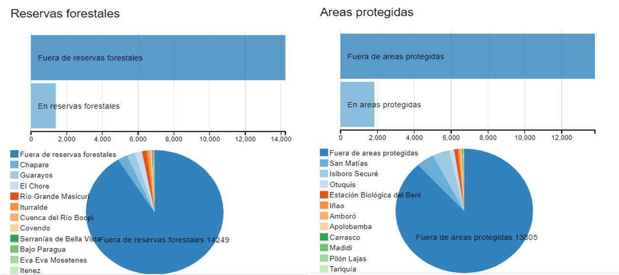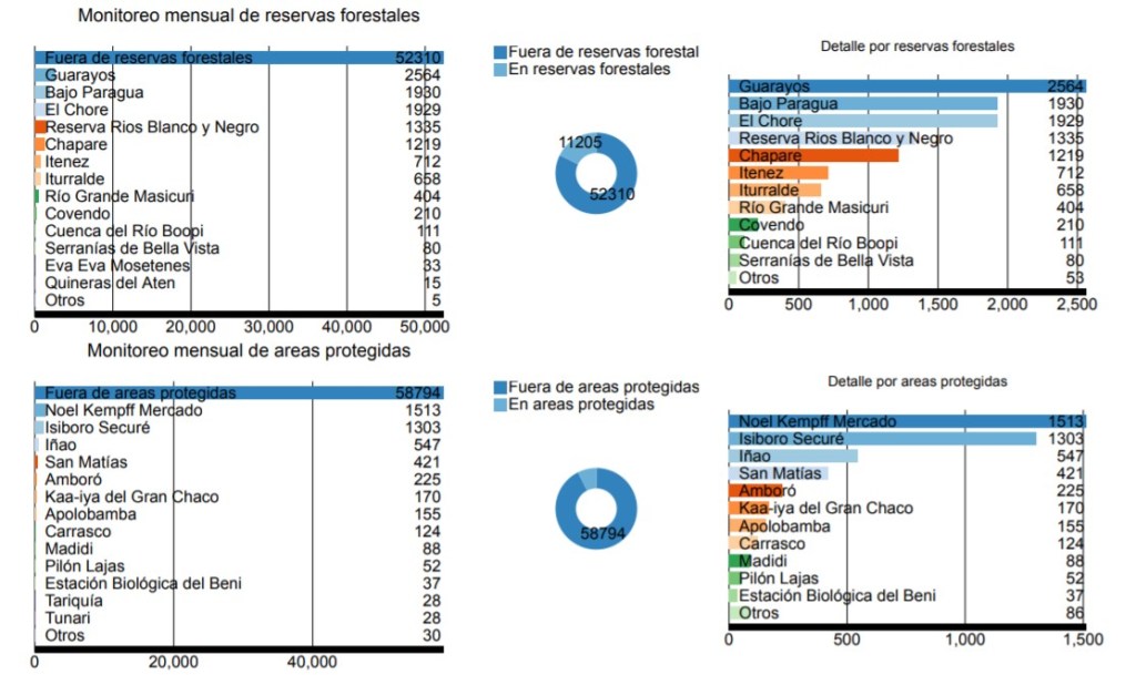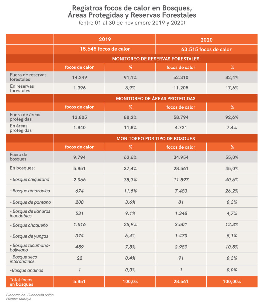 Las áreas protegidas con mayor incidencia de focos de calor durante 2020 fueron: Noel Kempff Mercado (1.513 focos), Isiboro Secrué (1303 focos) Iñao (547 focos) y San Matías (421 focos). Mientras que las reservas forestales con mayores registros de focos de calor fueron: Guarayos (2564 focos), El Chore (1929 focos) y Ríos Blanco y Negro (1335 focos) en Santa Cruz; Bajo Paragua (1930 focos) en el Beni; y Chapare (1219 focos) en Cochabamba.