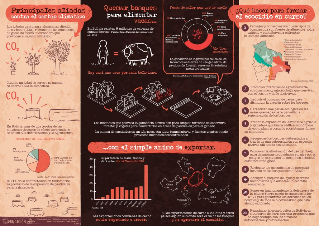 Actualmente en el país existen unos 9 millones de cabezas de ganado, una vaca por cada boliviano. No obstante, el Gobierno, en acuerdo con los grandes ganaderos, pretende ampliar la exportación de carne hasta el 2025. Desde el 2019 Bolivia comenzó a exportar carne a la China, y desde entonces las exportaciones en general van en crecimiento. Esto se traducirá en más deforestación y más quemas. Ante este escenario, es urgente tomar medidas drásticas para frenar este ecocido en curso.