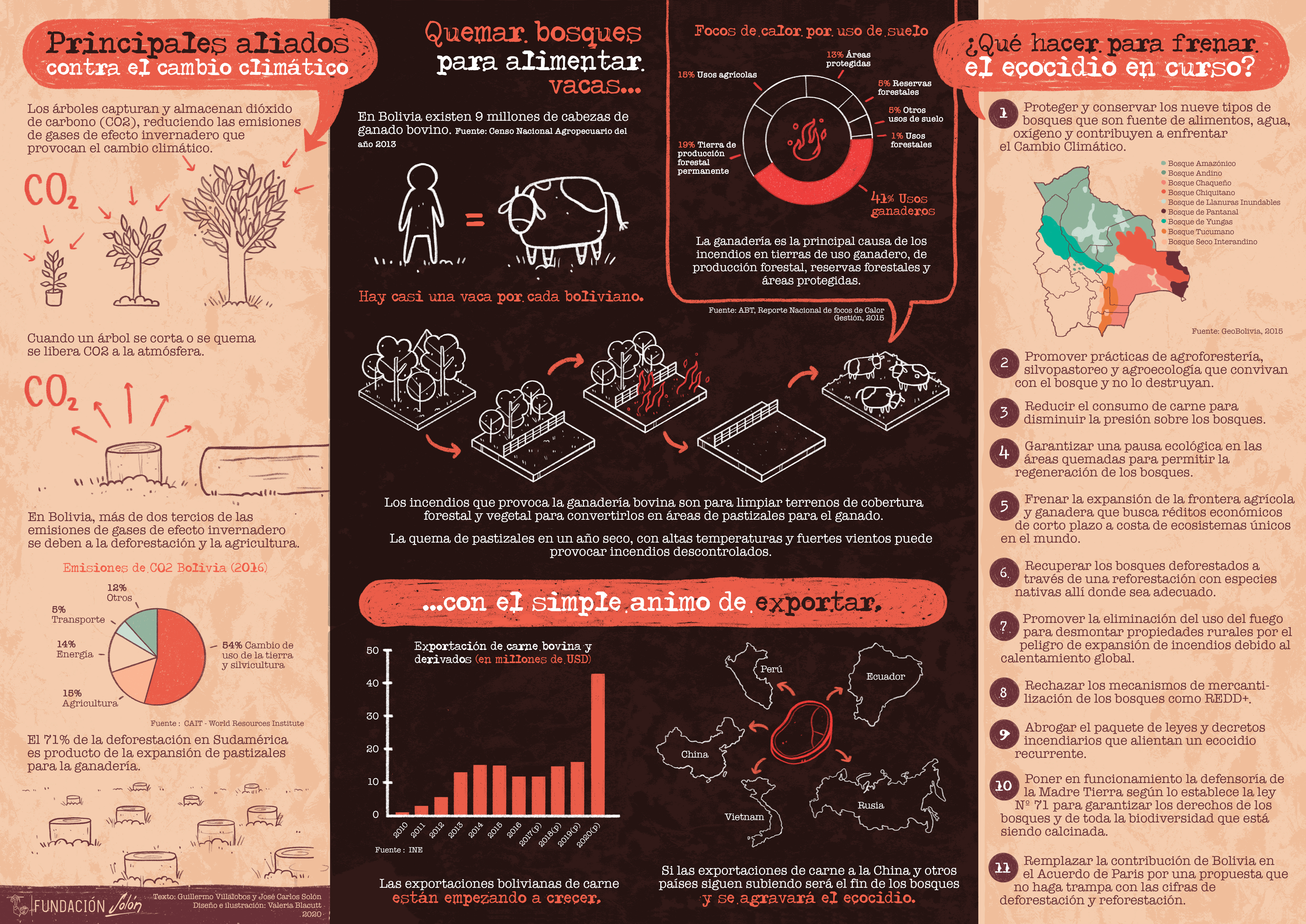 Actualmente en el país existen unos 9 millones de cabezas de ganado, una vaca por cada boliviano. No obstante, el Gobierno, en acuerdo con los grandes ganaderos, pretende ampliar la exportación de carne hasta el 2025. Desde el 2019 Bolivia comenzó a exportar carne a la China, y desde entonces las exportaciones en general van en crecimiento. Esto se traducirá en más deforestación y más quemas. Ante este escenario, es urgente tomar medidas drásticas para frenar este ecocido en curso.