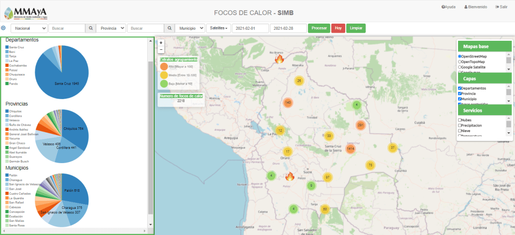 El mes de febrero del 2.021 registró 2218 focos de calor en todo el país, según el Sistema de Información y Monitoreo de Bosques (SIMB) del Ministerio de Medio Ambiente y Agua (MAAyA). Una disminución significativa en relación a febrero del 2020, cuando se registraron 4.444 focos de calor. Santa Cruz sigue siendo el departamento con mayor número de focos de calor (1945 focos), siendo las provincias de Chiquitos, Cordillera y Velazco los más afectados.