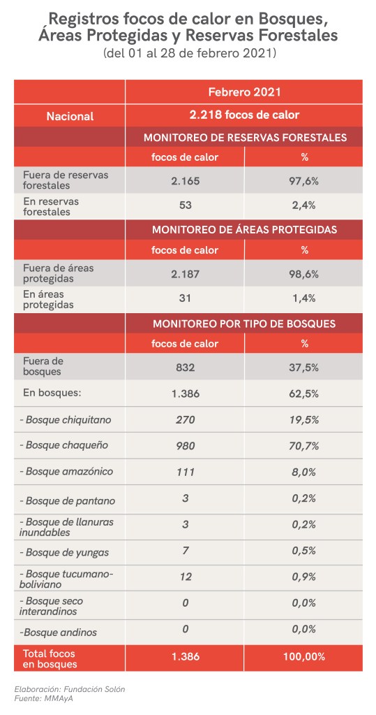 Por último, de focos de calor registrados en febrero del 2021, 1.386 focos se dieron en áreas con cobertura boscosa, equivalente al 62.5% del total de focos registrados. Esto significa un aumento porcentual en relación a febrero del 2020, cuando el 56% de los focos contabilizados se registraron en áreas boscosas. Los datos del SIMB señalan que el bosque chaqueño fue el más dañificado con 980 focos de calor, seguido por el bosque chiquitano (270 focos), el bosque amazónico (111 focos de calor), el bosque tucumano-boliviano (12 focos), el bosque de yungas (7 focos de calor) y el bosque de pantano y de llanuras inundables (con 3 focos de calor respectivamente).