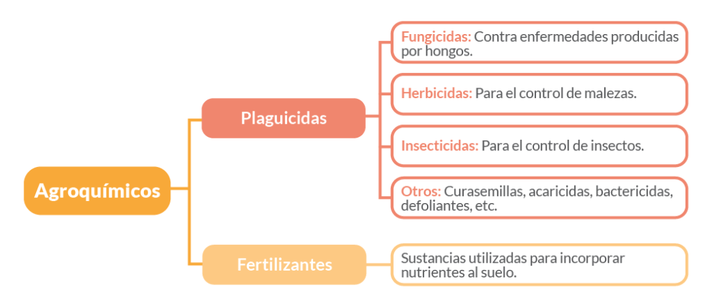 En términos generales, por agroquímico se entiende a cualquier sustancia o mezcla de sustancias naturales o sintéticas utilizado para prevenir, eliminar y/o controlar cualquier plaga, enfermedad o maleza en la actividad agrícola. A estas sustancias se las conoce comúnmente como plaguicidas o pesticidas – también referidas como fitosanitarios o protección de cultivos- las mismas que están conformadas por insecticidas, herbicidas, fungicidas, acaricidas, entre otros. Esta categorización también incluye a aquellas sustancias que buscan proporcionar elementos que incentiven el crecimiento de las plantas, conocidas como fertilizantes.[2] Así como sustancias reguladoras del crecimiento vegetal o fitorreguladores, de post cosecha y de tratamiento de semillas.[3]