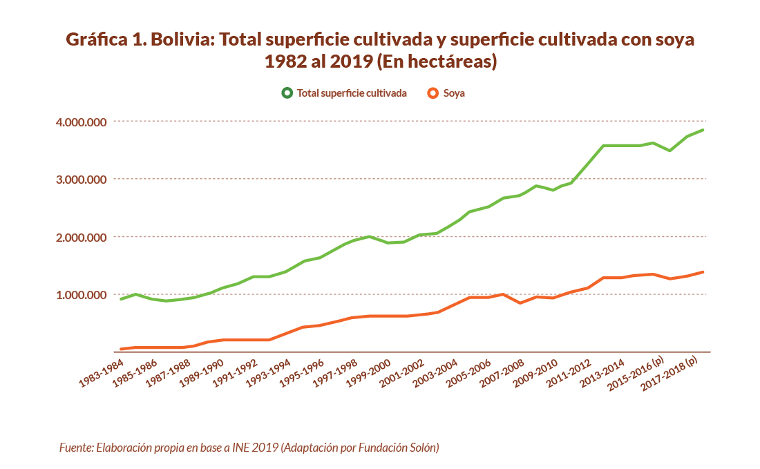 En el caso boliviano, como en Brasil y Argentina, el cultivo de soya poco a poco se fue posicionado como el pilar principal de este modelo agroindustrial. Así, bajo este modelo, la superficie cultivada con esta leguminosa se incrementó a pasos acelerados, pasando de significar apenas el 7,3% del total de superficie cultivada en 1985-1986 a representar el 38,6% del total de superficie cultivada del país en el 2004-2005 (Gráfica 1).