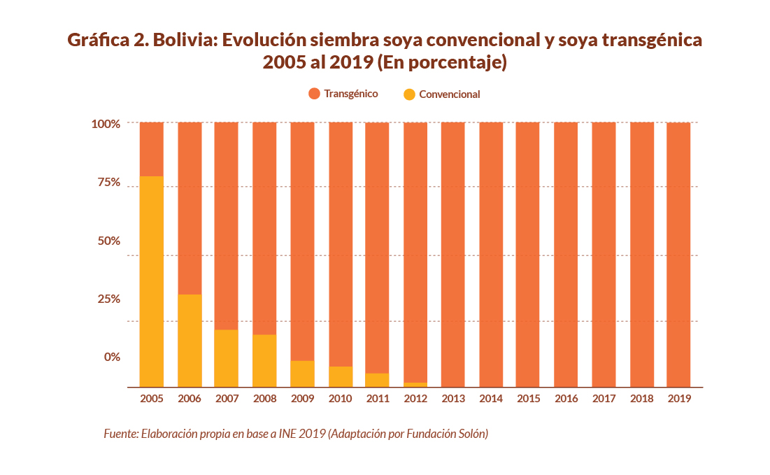 El hito fundamental que terminó de implantar este modelo agropecuario que llevaría a la “modernización” de la agricultura boliviana fue la Resolución Ministerial N° 1 del 7 de abril de 2005 que autoriza por primera vez la “producción agrícola y de semillas, procesamiento, comercialización interna y externa de soya genéticamente modificada resistente a glifosato evento (40-3-2)”. A partir de ese momento la siembra con soya transgénica se expandió rápidamente. Para 2012 prácticamente toda la soya sembrada en el país era soya transgénica evento 40-3-2 (conocida comercialmente como soya RR “Roundup Ready”) (Gráfica 2).