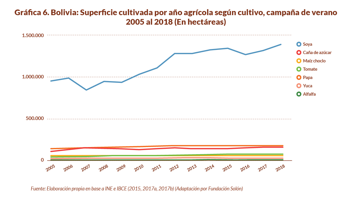 A pesar de sus deficiencias, el aumento de la superficie cultivada y la producción de soya son significativos si se los compara con otros cultivos que conforman la canasta básica alimentaria nacional. Durante 2005 y 2018, la superficie cultivada de papa y maíz, por ejemplo, solo se incrementó en 35.466 y en 3.469 hectáreas respectivamente. Este mismo patrón lo siguen otros cultivos, como ser: tomate, ajo, haba, yuca, cebada e incluso forrajes como la alfalfa (Gráfica 6). Dicho con otras palabras, el país expandió significativamente la superficie cultivada destinada a la producción de materias primas agrícolas, pero no así la superficie destinada de cultivos que conforman la canasta básica.