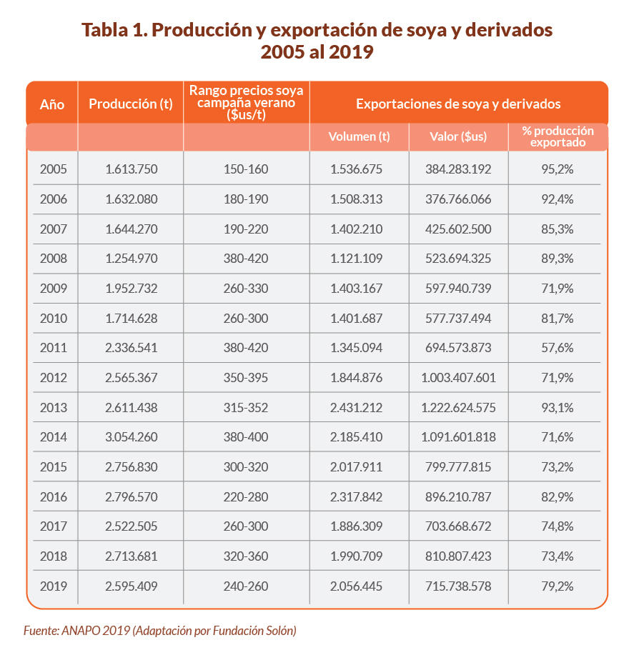 Si bien el modelo agroindustrial hace varias décadas atrás reproduce un discurso filantrópico de contribuir a la seguridad alimentaria del país, por definición este modelo agrario se caracteriza por su enfoque dirigido a la exportación de materias primas agrarias. Aunque existen variaciones de acuerdo al año agrícola, la amplia mayoría de la soya producida en el país está destinada a la exportación (Tabla 1).