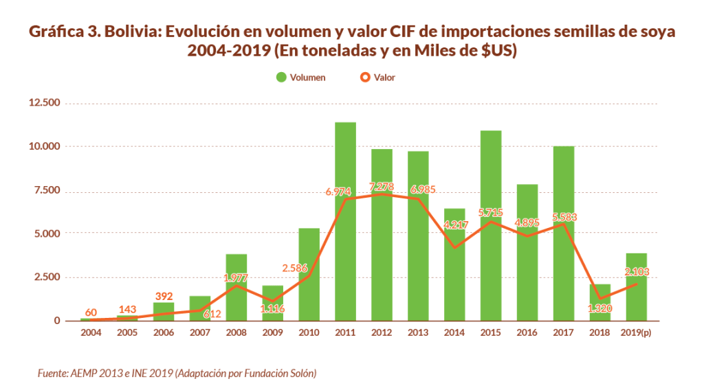 La “modernización” agrícola supuso, asimismo, una nueva dependencia de los paquetes tecnológicos propios de este modelo agroindustrial, tales como las semillas certificadas y patentadas. Al ser Bolivia un importador neto de estos insumos, se crearon nuevas dinámicas económicas en base a su comercialización. Así, desde que se autorizó la producción con soya RR, las importaciones de semillas certificadas para la siembra se incrementaron velozmente, pasando de 354 toneladas en 2005 a 3.901 toneladas el 2019 (Gráfica 3). Siendo el pico más alto en 2011 cuando se importaron más de 11 mil toneladas por un valor CIF de 6.9 millones de dólares americanos (AEMP, 2013). A partir de entonces hubo variaciones importantes en los volúmenes y valores de importación; con picos importantes en 2015 y 2017, y luego una estridente bajada en los últimos años (INE, 2019).