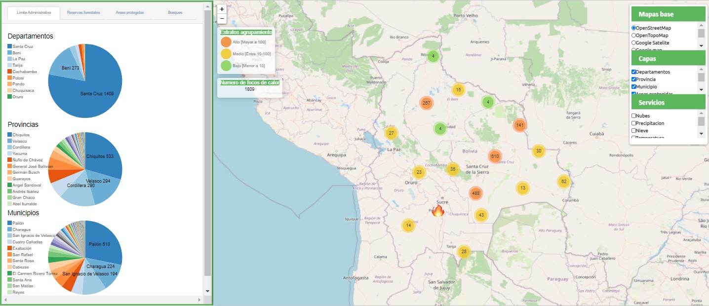 Santa Cruz, con 1.409 focos de calor, fue el departamento donde se registró la mayor cantidad de puntos de calor, seguido luego por Beni con 273 focos. La concentración de focos de calor durante el mes de marzo en los estos dos departamentos es un patrón que se mantiene desde los últimos 10 años; exceptuando marzo del 2020 cuando por primera vez Tarija superó a Beni y se posicionó en segundo lugar[1].