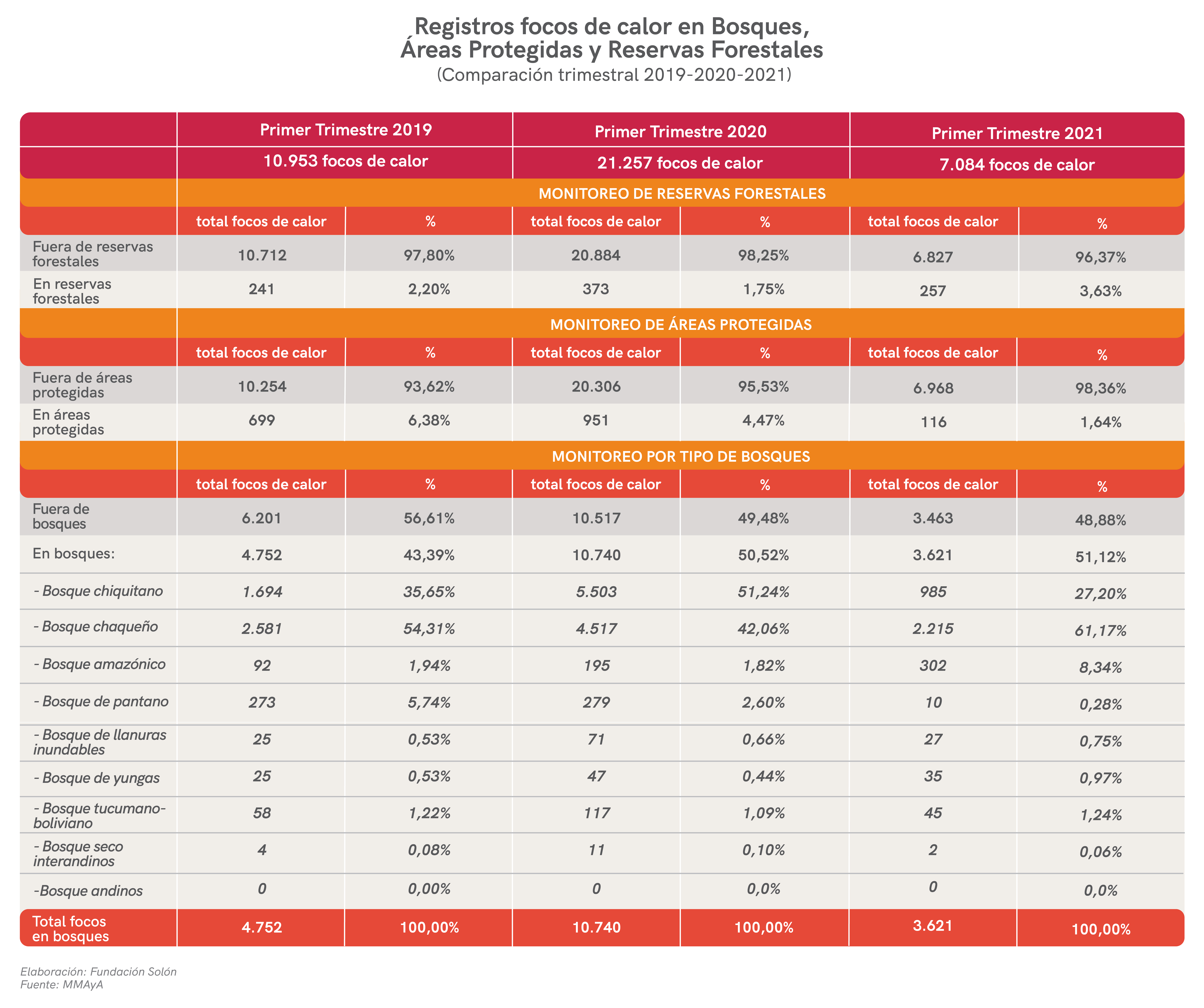 Los datos del SIMB evidencian que la mayoría de los focos de calor se registran en áreas con cobertura boscosa. Del total de focos acumulados durante el primer trimestre de este año, 3.621 se detectaron en áreas con cobertura boscosa, equivalente al 51% del total de los focos de calor acumulados. Este porcentaje es casi igual al 2020, cuando el 50% (10.740 focos) de los focos de calor acumulados durante el primer trimestre de ese año se registraron en áreas con cobertura boscosa. Mientras que, durante el primer trimestre del 2019, el 43% (4.752 focos) del total de focos de calor acumulados se dieron en áreas con cobertura boscosa.