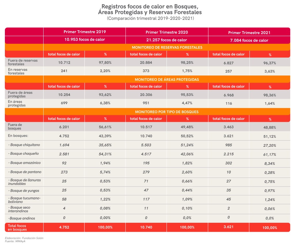 Sólo durante el mes de marzo del 2021 el Sistema de Información y Monitoreo de Bosques (SIMB) del Ministerio de Medio Ambiente y Agua (MAAyA) registró 1.809 focos de calor en todo el país, una cifra significativamente menor en comparación con marzo del 2020 cuando se registraron 8.012 focos de calor.