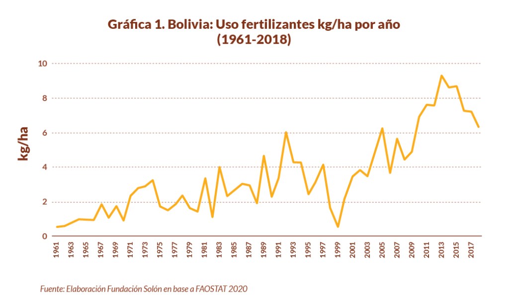 El empleo de agroquímicos en Bolivia siguió a escala el mismo patrón que se imponía al resto del sur global. Ya desde los años cuarenta, bajo el impulso del Plan Bohan, Bolivia se perfilaba a desarrollar un nuevo modelo agrario enfocado sobre todo en la parte oriental del país. Con la “Marcha al Oriente” a finales de la década de los cincuenta, y mediante programas de donación y apoyo humanitario enmarcadas en el discurso de revolución verde, el uso de agroquímicos – principalmente plaguicidas organoclorados y fertilizantes nitrogenados – comenzó paulatinamente a incrementarse en el país (Chilón, 2017; Bickel, 2018). A partir de los años sesenta – y a pesar de la alta variabilidad en los valores por área cultivada de un año al otro[2] – la tendencia en el uso de fertilizantes siempre fue ascendente (Gráfica 1). Así, bajo este nuevo modelo de desarrollo agrícola, Bolivia pasó de utilizar 0,55 kg de fertilizantes por hectárea en 1961 a 3,29 kg/hectárea en 1981[3].