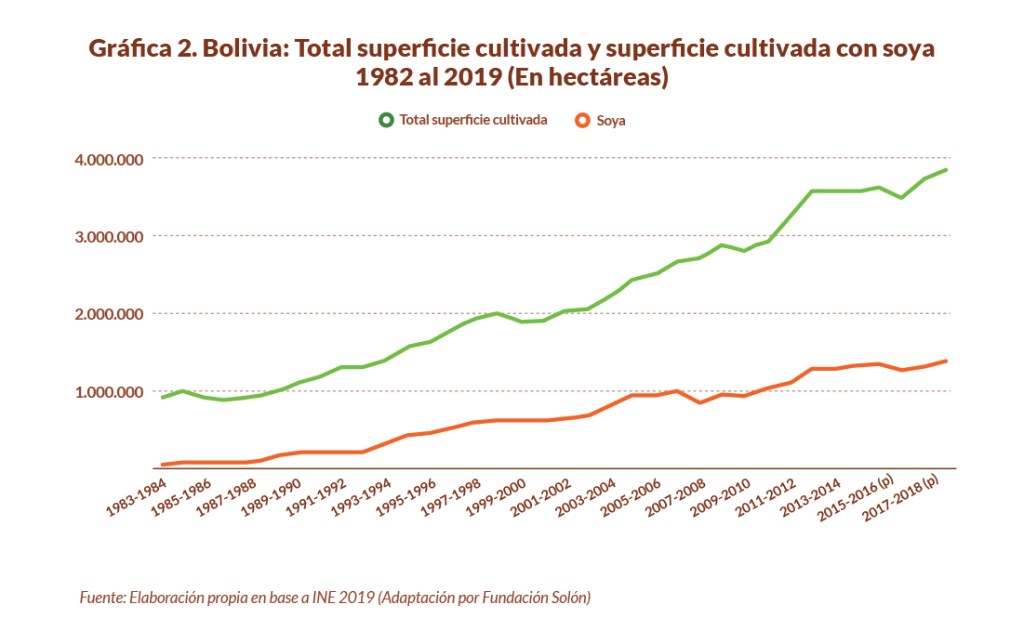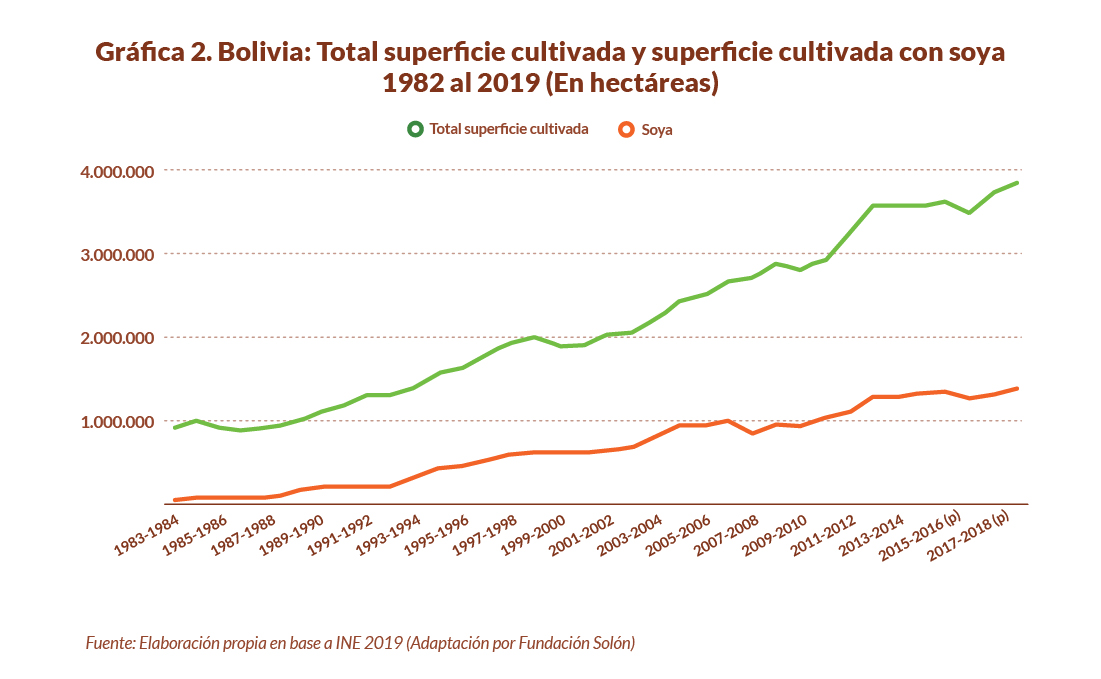 A partir de mediados de los años ochenta y durante toda la década de los noventa, con la liberación económica y la introducción de nuevos paquetes tecnológicos, el paradigma agropecuario del país comenzó a afianzarse cada vez más hacia el modelo agroindustrial de exportación de commodities agrícolas; donde el cultivo de soya lentamente se impuso como el pilar central de este modelo. En consecuencia, la superficie cultivada con soya pasó de representar el 7,3% del total de la superficie cultivada del país entre 1985 y 1986 a ser el 38,6% del total de la superficie cultivada entre 2004-2005 (Gráfica 2) (INE, 2019).